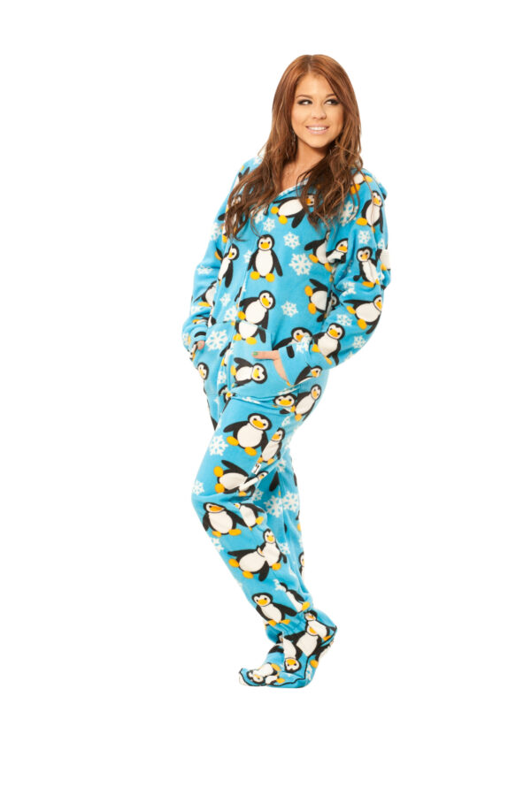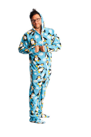 Stay warm and stylish in the Penguins Adult Footed Onesie Pajamas. Featuring a charming penguin and snowflake design on a light blue background, this onesie is crafted from 100% soft polar fleece for ultimate comfort. Equipped with a hood, thumb holes, and front pockets, it’s the perfect outfit for lounging on chilly days. Get yours now at a special sale price—ideal for penguin lovers everywhere!