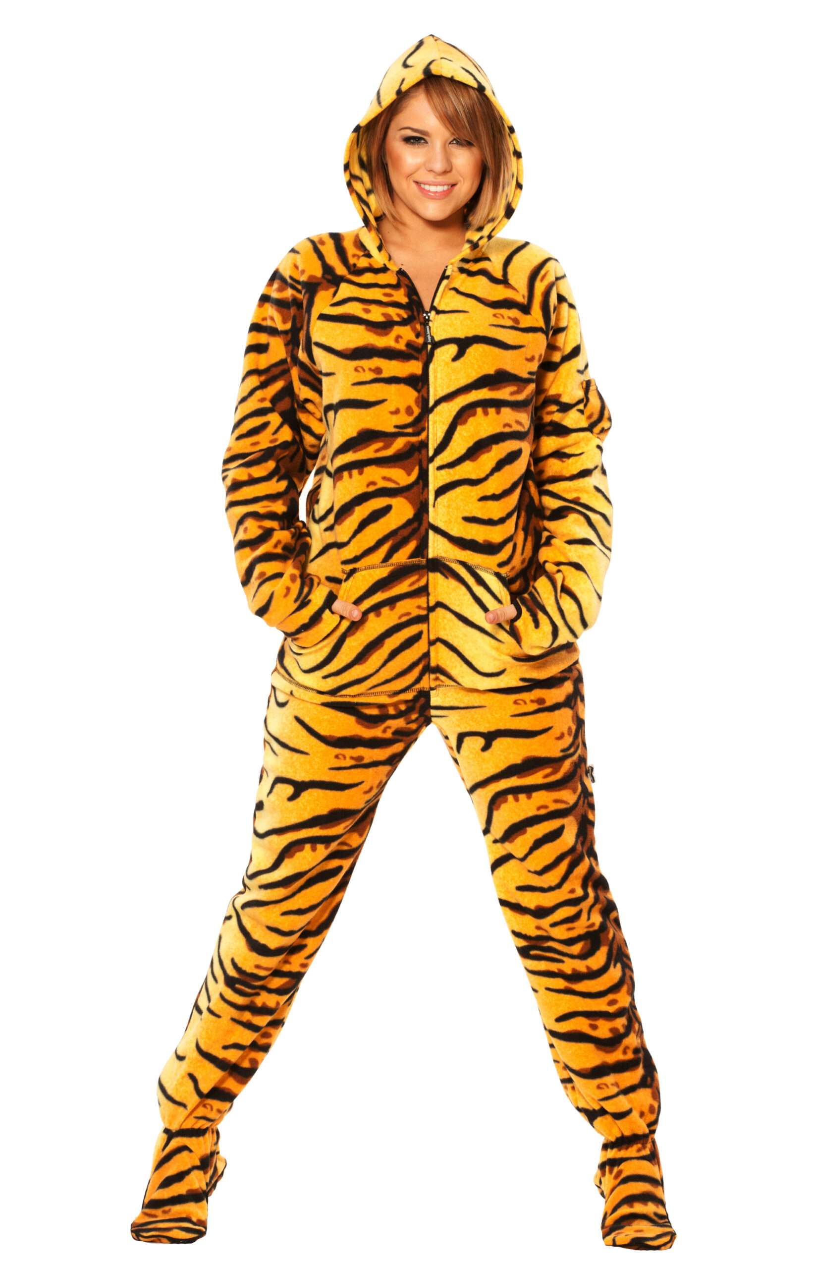 Unleash your wild side with the Tiger Adult Footed Costume Onesie, featuring a bold tiger stripe print on soft, cozy fleece. Perfect for lounging or costume parties, this onesie offers comfort with its hood, thumb holes, and front pockets. Whether you’re dressing up or staying in, this fun and functional onesie is a perfect addition to your wardrobe. Available now on clearance, get yours before it’s gone!